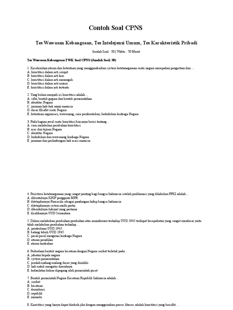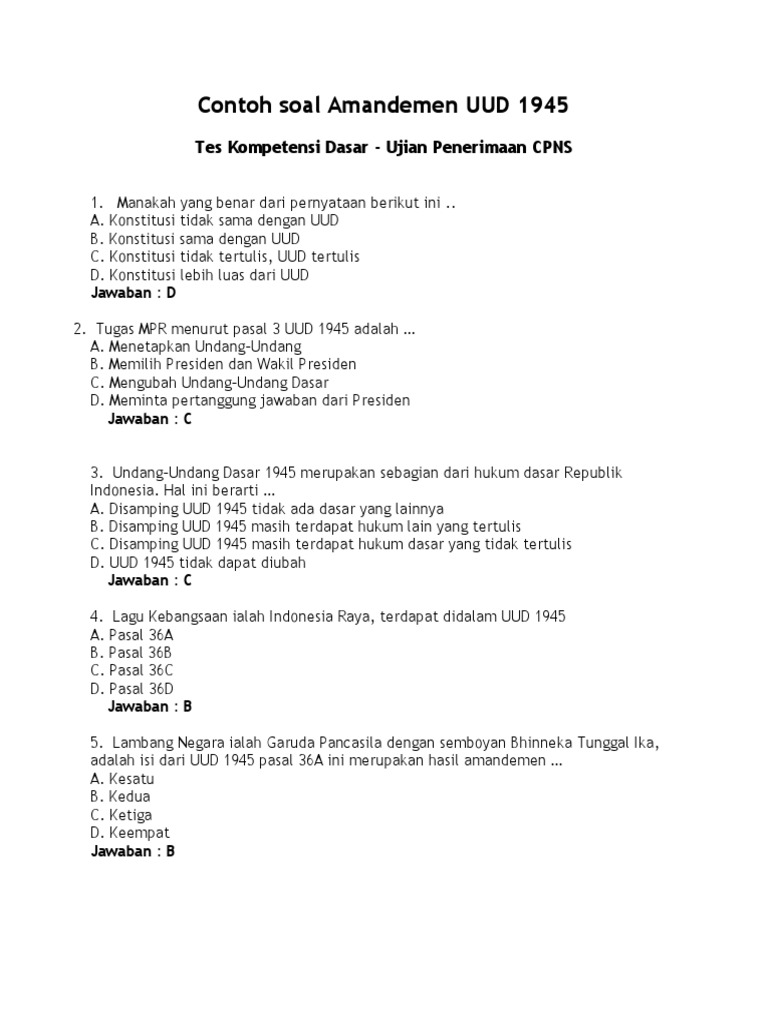 Contoh Soal Cpns Uud 1945 : 17 Contoh Soal Cpns Hukum Kumpulan Contoh Soal : Kunci jawaban contoh soal cpns.. Menciptakan kerukunan hidup menuju masyarakat adil dan makmur 2. Uud 1945 juga mempunyai fungsi dan perubahan sebagai alat control yang berarti … 100 contoh soal twk cpns 2019 ini terdiri dari soal uud 1945, soal pancasila, soal nkri, dan bhinneka tunggal ika. 70 menit tes wawasan kebangsaan twk soal cpns (jumlah soal: Savesave contoh soal uud 1945.pdf for later.